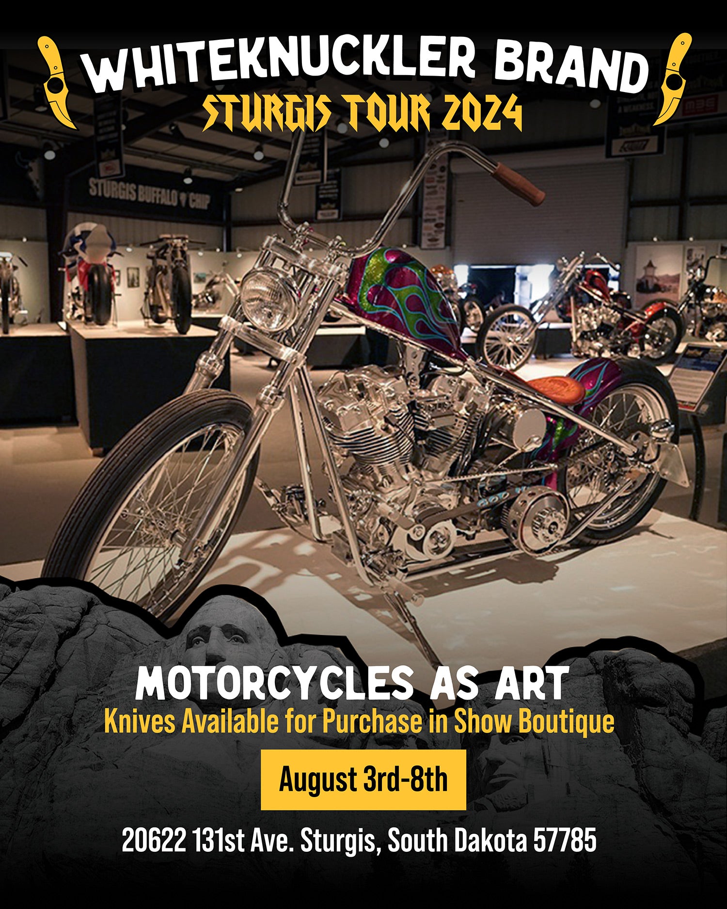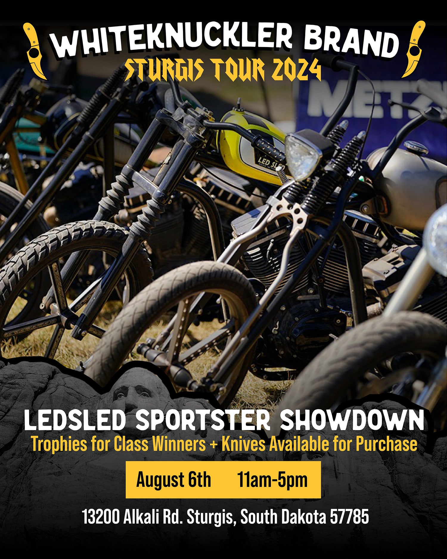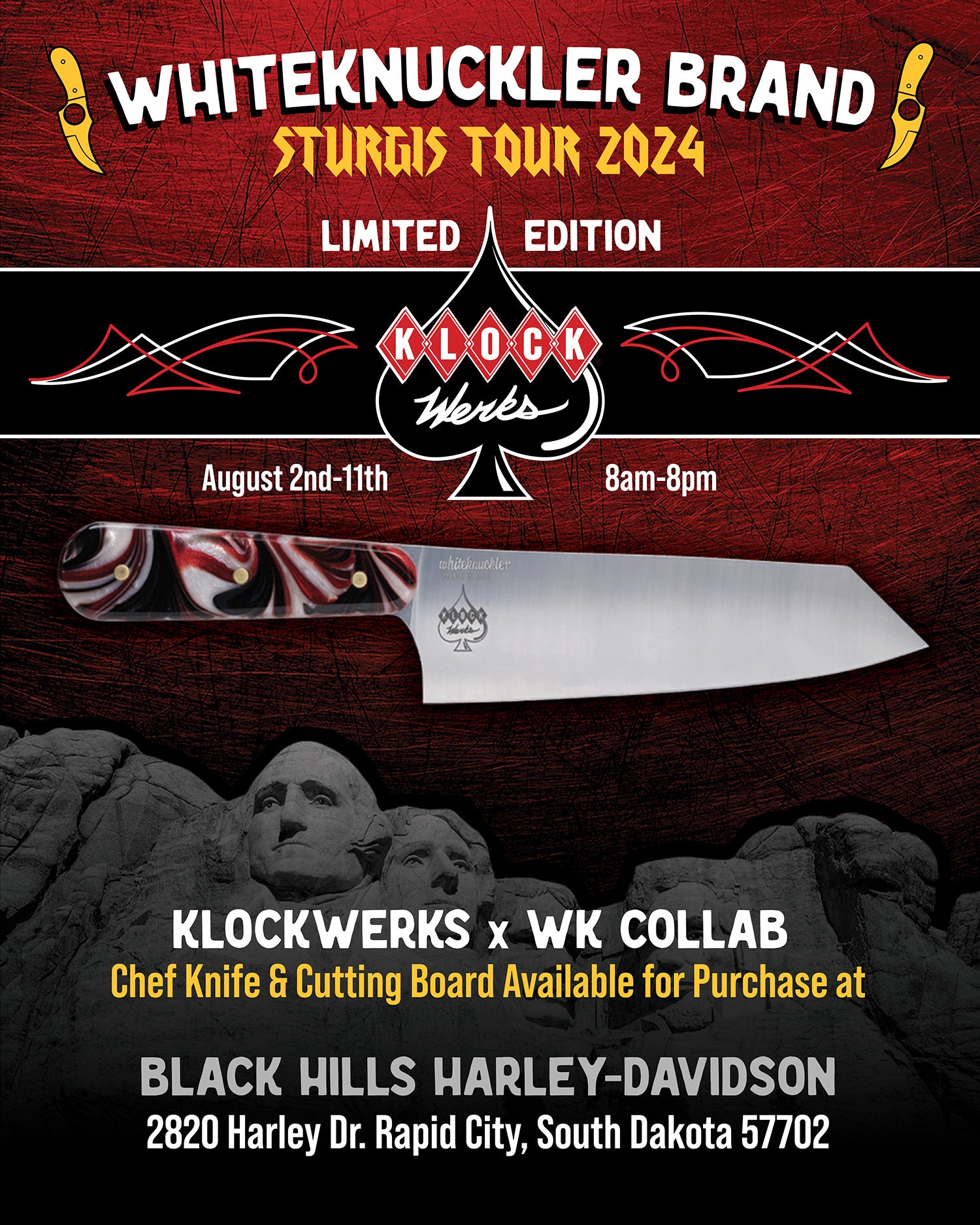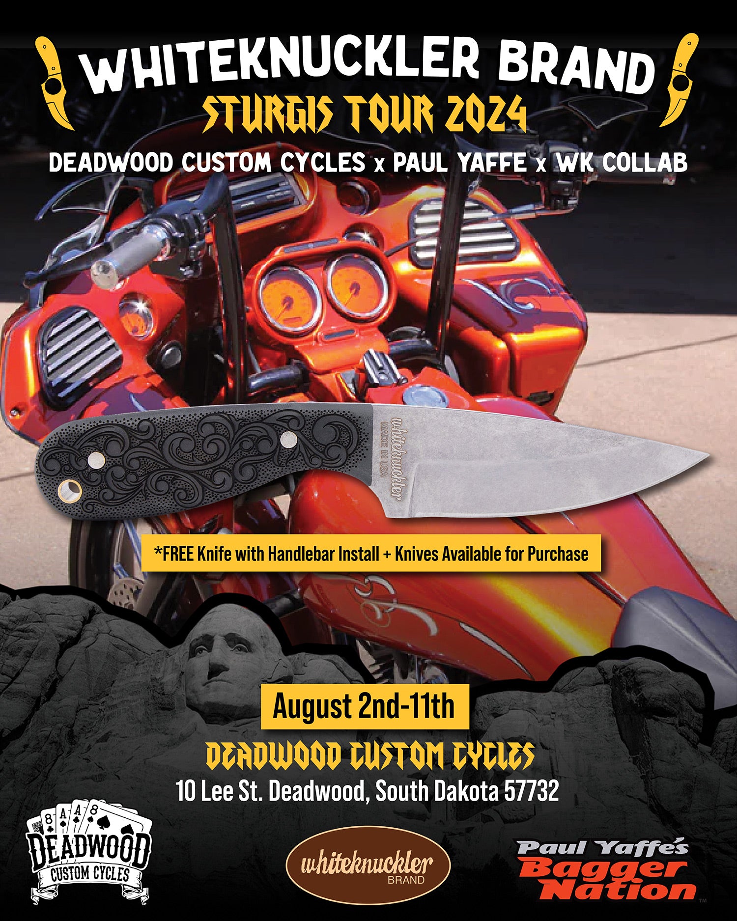 Deadwood Custom Cycles, Paul Yaffe Originals, and Whiteknuckler Brand are teaming up to bring you a unique experience in custom motorcycling! Get Paul’s famous Monkey Bars installed at Deadwood Custom Cycles during the 2024 Sturgis Motorcycle Rally and claim a beautiful, free, made-in-USA Whiteknuckler knife — each will be engraved with 84th Sturgis Rally!