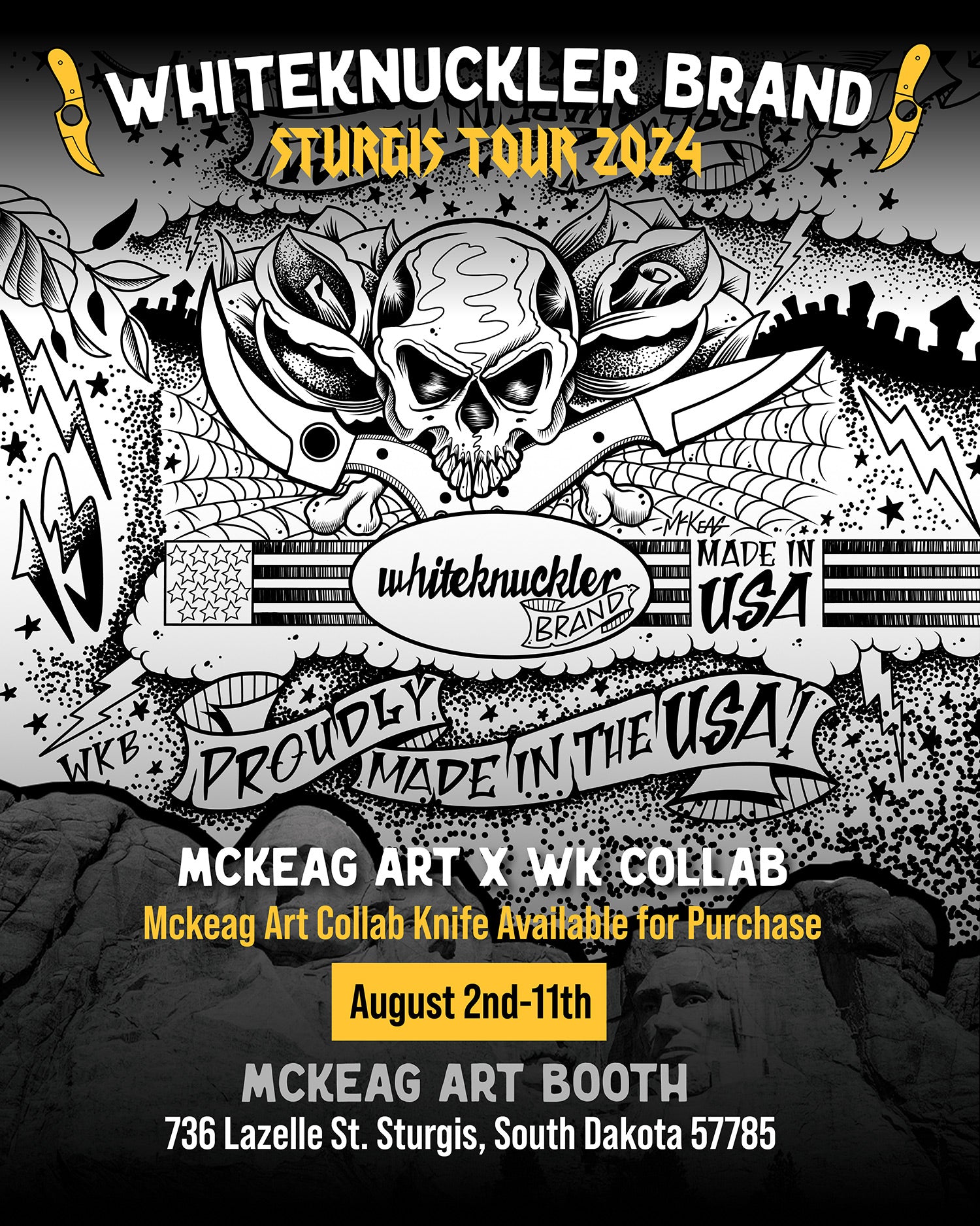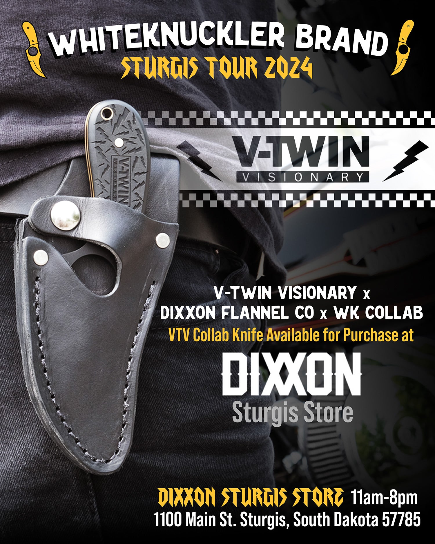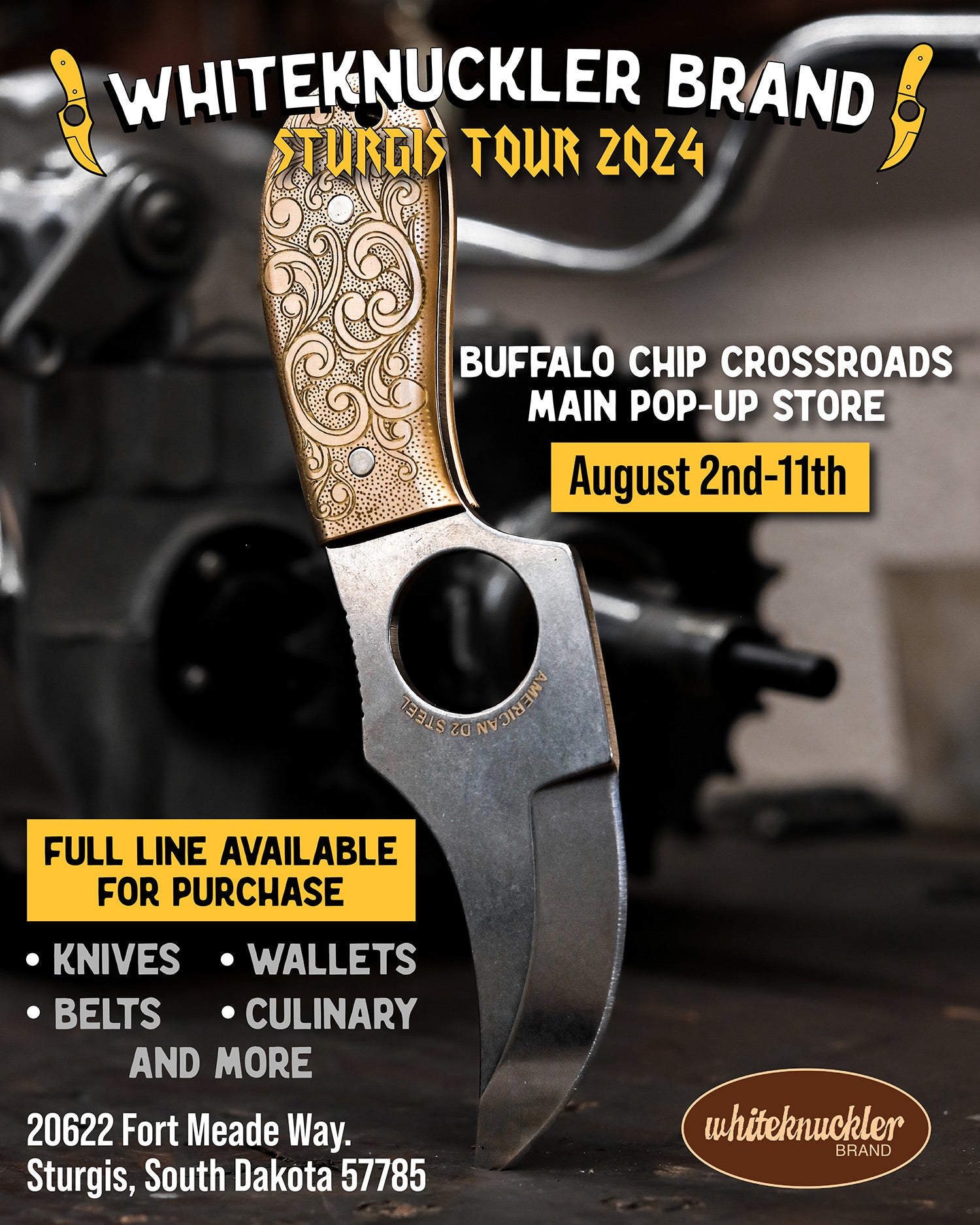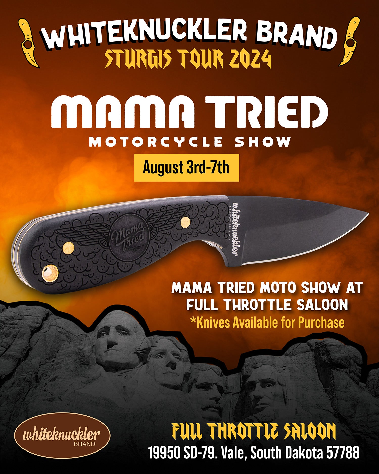Deadwood Custom Cycles, Paul Yaffe Originals, and Whiteknuckler Brand are teaming up to bring you a unique experience in custom motorcycling! Get Paul’s famous Monkey Bars installed at Deadwood Custom Cycles during the 2024 Sturgis Motorcycle Rally and claim a beautiful, free, made-in-USA Whiteknuckler knife — each will be engraved with 84th Sturgis Rally!