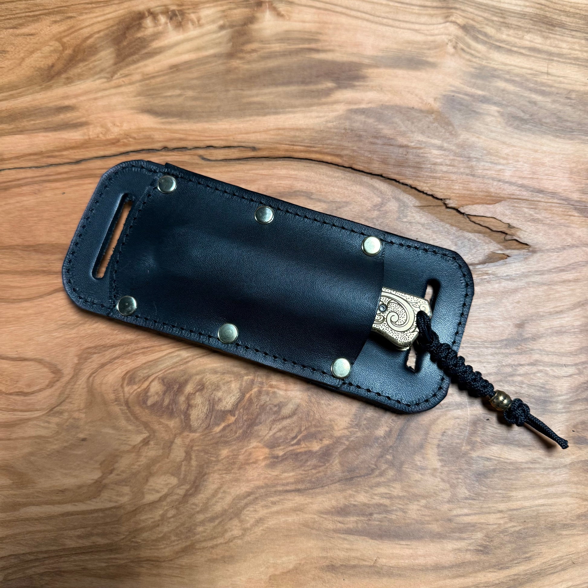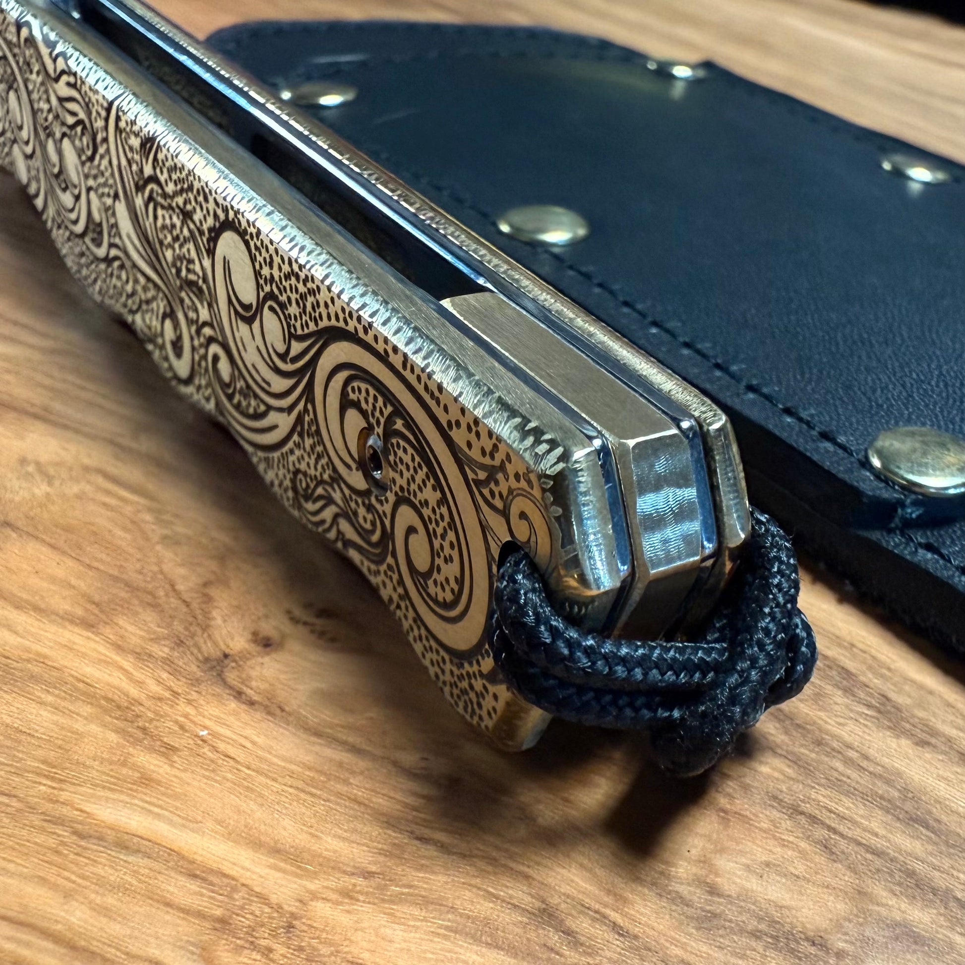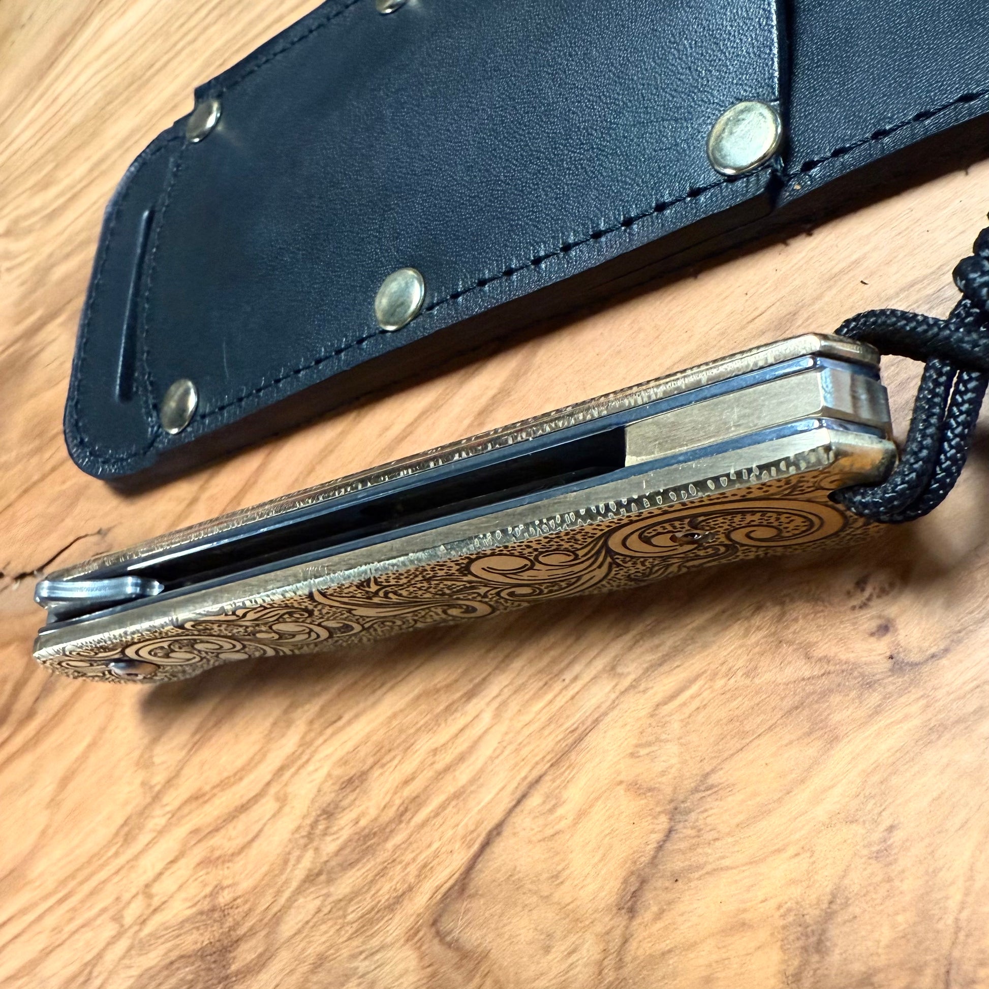 From the sweeping flow of the lines to the deep contrast of patterns, the F1’s design echoes a modern reinterpretation of classic blade art. The solid brass handles are hand-drawn and machine-engraved with precision scrollwork, giving each piece a unique fingerprint of artistry. This is a knife you’ll want to carry! Slide it into you pocket or carry it in the horizontal mount belt sheath!